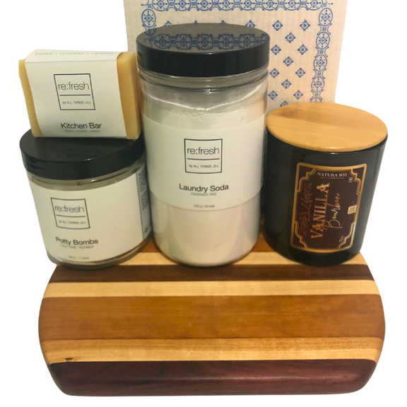 This delightful gift is filled with all-natural and environmentally-friendly cleaners and delights that will ignite a fresh beginning - ideal for a housewarming gift or anyone seeking a fresh start! Includes: